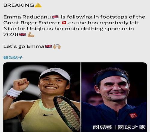 我们再来关注球员动态。北京时间昨晚,有外媒报道,称英国一姐拉杜卡努在2026赛季将结束和耐克4年的合作关系,转而牵手日本的服装赞助商优衣库。球迷们都知道,‌2018年,瑞士天王费德勒结束与耐克长达24年的合作,与优衣库签订了长达‌10年3亿美元‌的天价代言协议,成为这个品牌首位网球领域的全球大使。‌‌这一次,拉杜卡努也牵手优衣库,要和费天王作伴啦!至于双方的代言金额,目前还没有披露,估计也得是个大价钱。