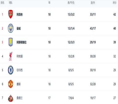 在积分榜上,阿森纳以42分高居榜首。曼城紧随其后,拿到40分。阿斯顿维拉继续高歌猛进,拿到39分,排名第3。利物浦赢球之后,总积分达到32分,超越切尔西升到第4名。切尔西依然是29分,掉到第5名。而曼联也是29分,排名第6。