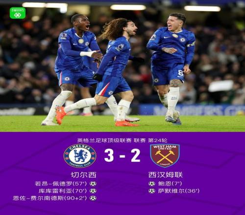 北京时间2月1日英格兰足球顶级联赛第24轮,切尔西主场对阵西汉姆联。切尔西若昂-佩德罗破门,库库雷利亚破门,恩佐-费尔南德斯破门。西汉姆联鲍恩破门,萨默维尔破门。最终比分切尔西 3-2 西汉姆联。
